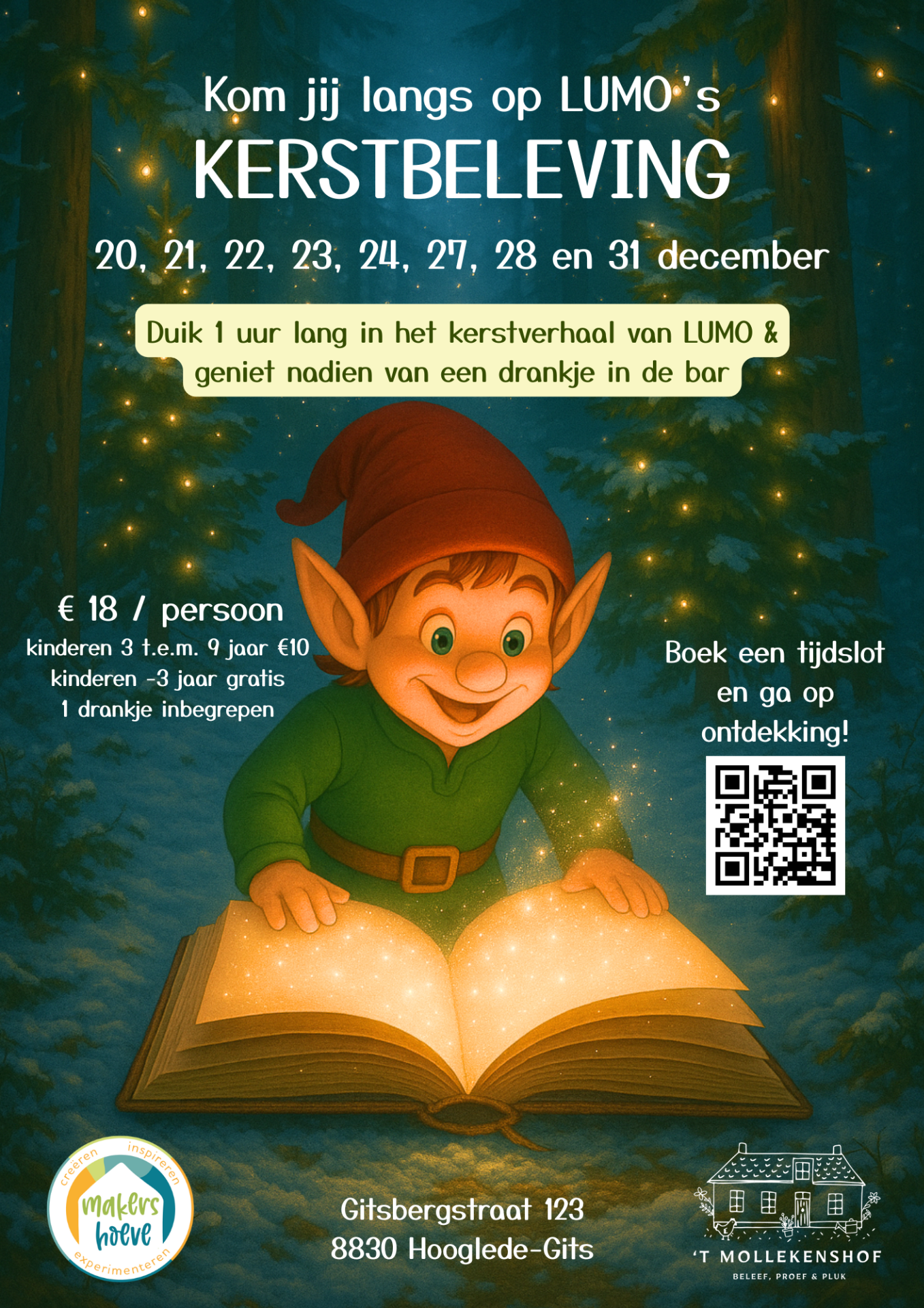 In de kerstvakantie openen we onze deuren met een unieke kerstbeleving, uitgewerkt samen met MakersHoeve. Duik in het verhaal van LUMO het kerstelfje. Pagina per pagina ga je op ontdekking in het elfenbos. Speur mee, raak betoverd en geniet van een wereld gevuld met een vleugje fantasie. Wie weet kraak je de code en kan je zo de échte kerstsfeer bemachtigen.